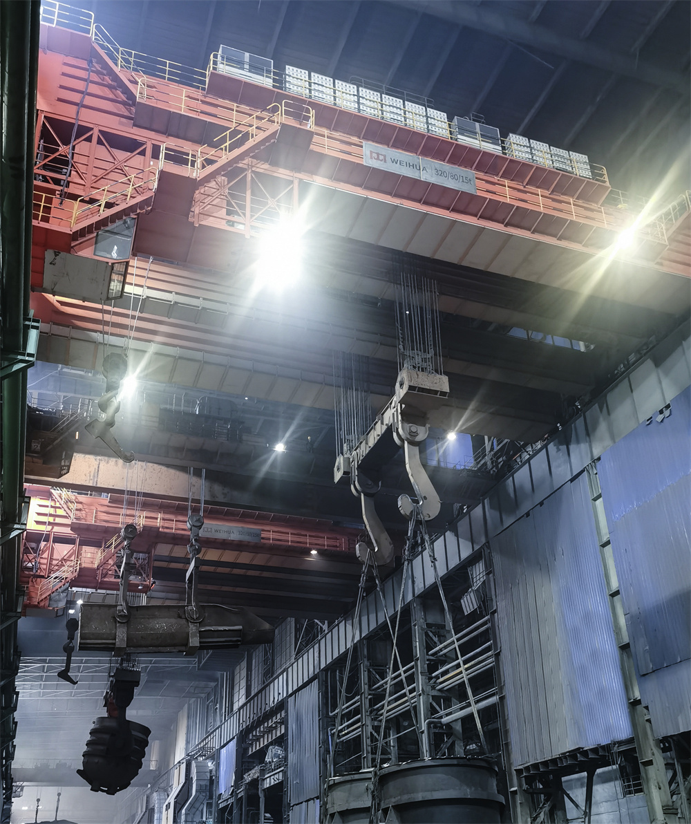 该项目包含320/80/15t-25m铸造起重机3台与320/80/15t-31m铸造起重机2台,目前已顺利投入客户车间冶金生产作业。