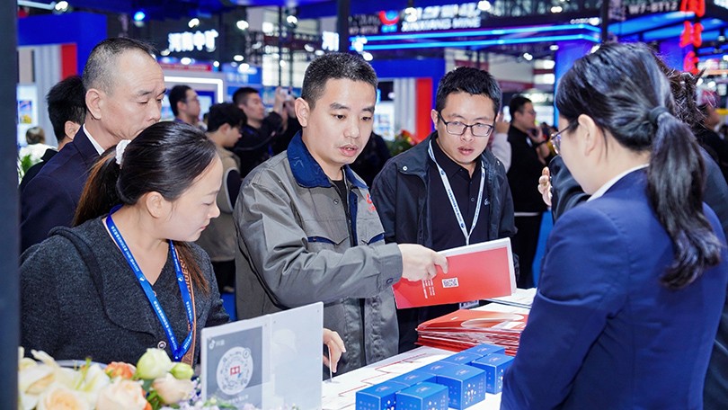河南金年会|jinnianhui总裁冯军(左一)为参展嘉宾介绍金年会|jinnianhui概况