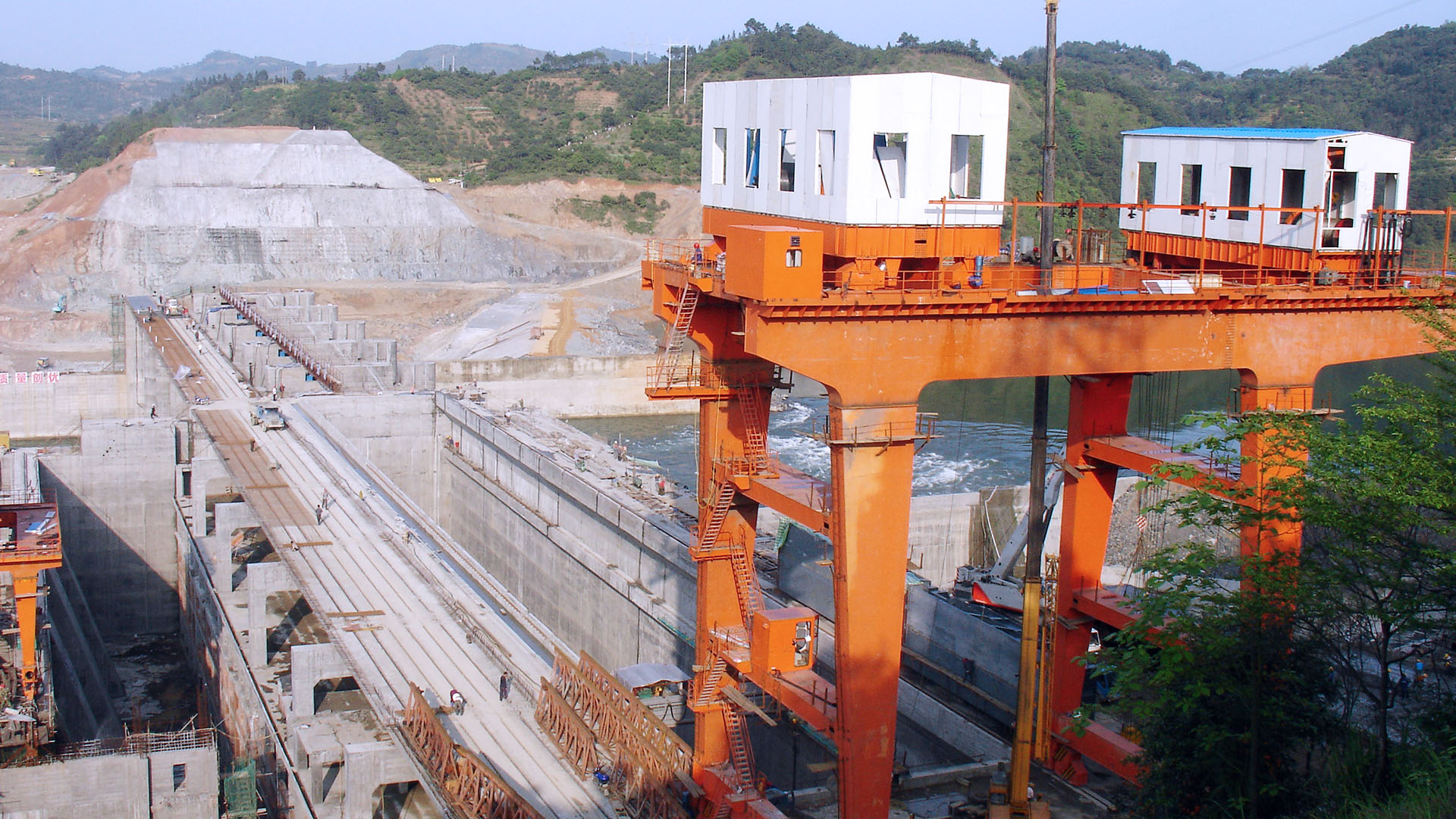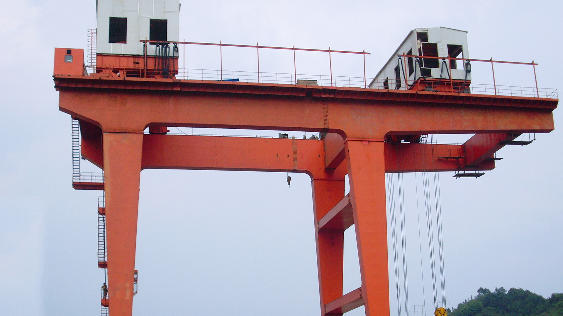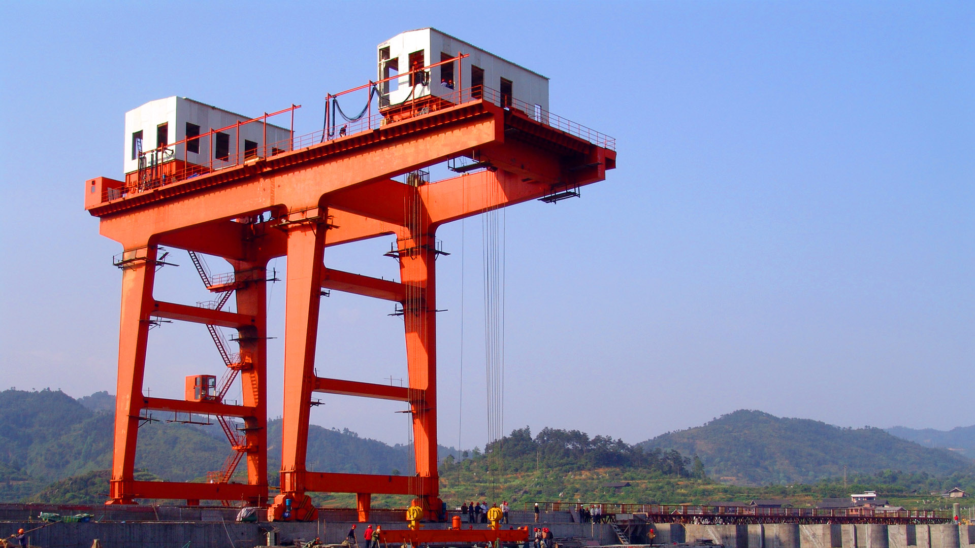 坝顶门式起重机为安装在水电站坝顶上的门式起重机。多为双向或单向移动式门机,由主起升小车、回转起升机构、大车行走机构、门架、司机室、各种电器设备和保护装置组成。用于启闭进水口检修闸门、船闸上闸首挡洪门,水轮机大件吊运及船闸冲沙闸工作闸门和其固定起闭机的安装和检修,将有关闸门吊运至闸门检修室进行检修与存放;回转吊用于坝顶小型设备的吊运等工作。